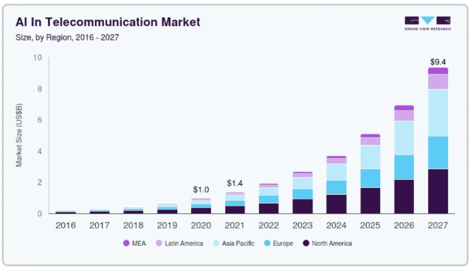 40. The global AI in telecom market is projected to reach USD 11.29 billion by 2030, growing at a CAGR of 28.2% from 2023 to 2030. (Grand View Research)