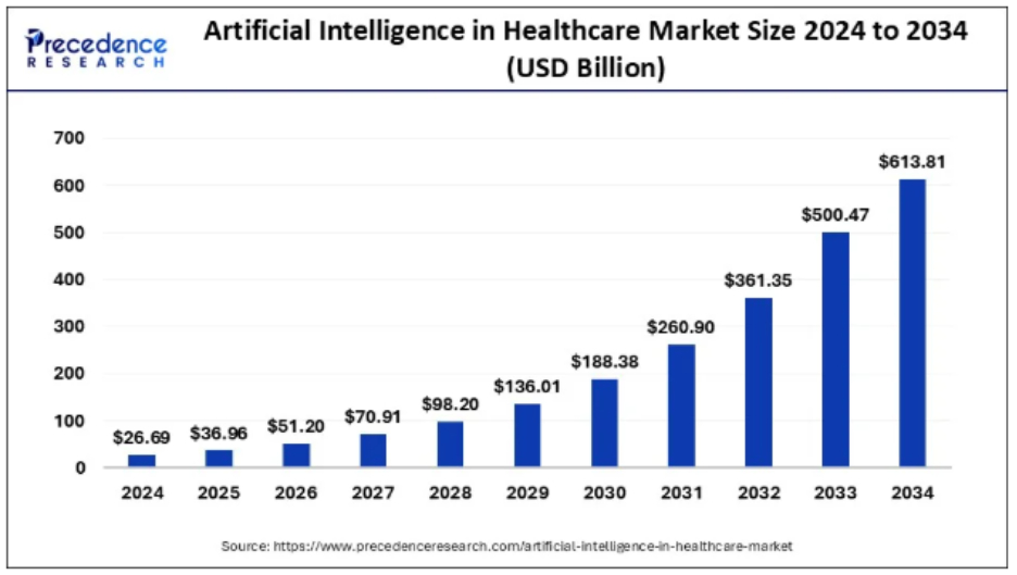32. AI in healthcare market was estimated at USD 26.69 billion in 2024 and is forecast to rise from USD 36.96 billion in 2025 to about USD 613.81 billion by 2034, a 36.83% CAGR for 2025 to 2034. (Precedence Research)