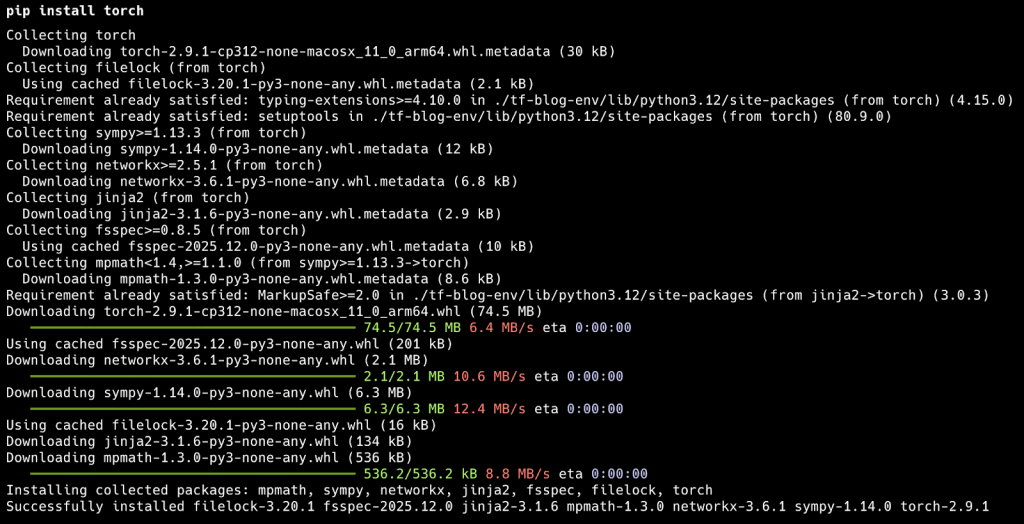 With Python 3.12 all setup, install TensorFlow (which has built-in Keras) on the machine by triggering the following commands on the terminal: