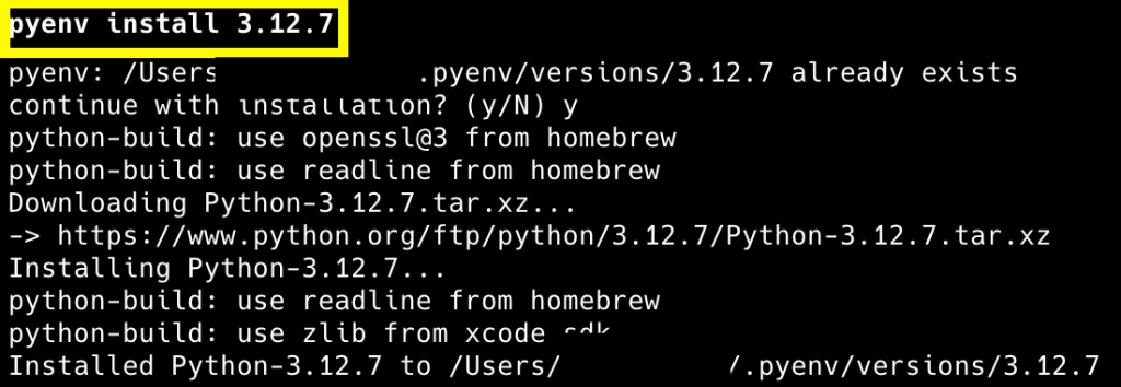 Run the command pyenv install 3.12.7 on the terminal to install Python v3.12. Post installation, run the command python3.12 –version for checking if the installation was successful (or not)