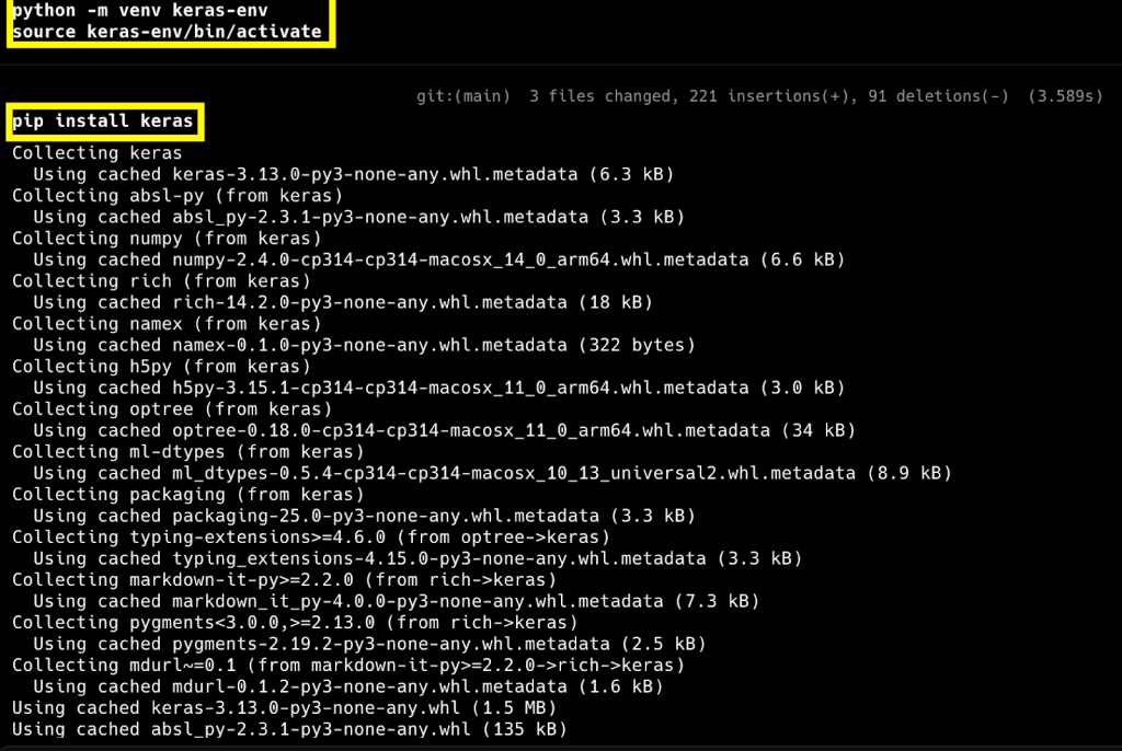 Now that venv is created, run the command pip install keras in the virtual environment to install the Keras framework.