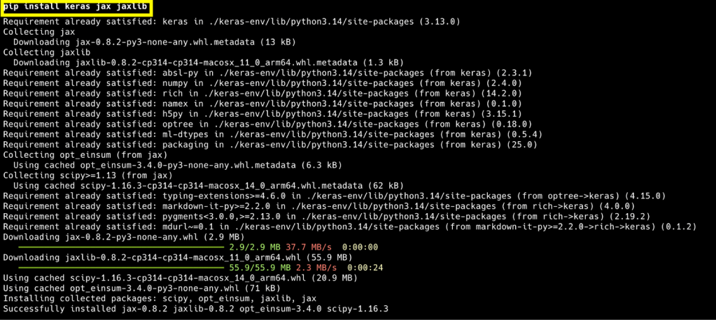 Alternatively, you can install another supported backend, such as JAX, to verify that the Keras installation was successful. To install JAX, run the following command in the terminal: