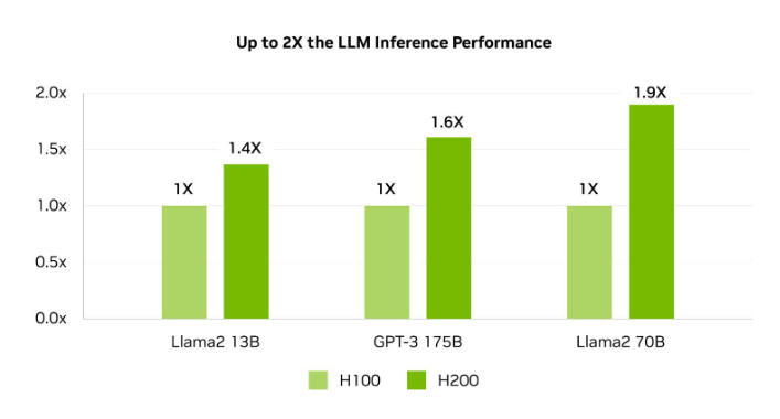 In NVIDIA’s published benchmarks, H200 demonstrates improved training throughput over the H100 for Llama-class models. This is largely due to its 141 GB of HBM3e memory at 4.8 TB/s bandwidth which reduces the need for rematerialization and host memory traffic.
