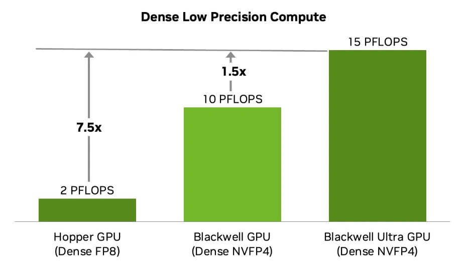 Figure 6: Blackwell Ultra GPU delivers 1.5x more dense NVFP4 throughput compared to Blackwell [Image Source]