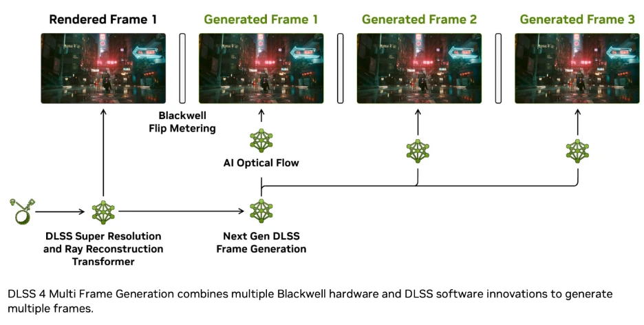 The AI multi-frame generation boosts DLSS 4’s frame rates up to 2x over the previous DLSS 3/3.5, while maintaining or exceeding native image quality and providing low system latency.