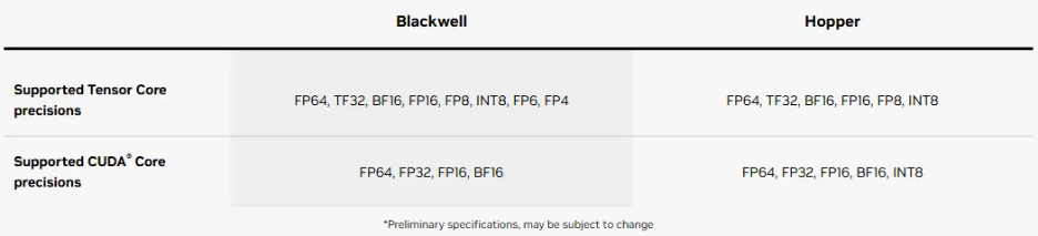 The Hopper architecture had support for FP64, FP32/TF32, FP16/BF16, FP8, and INT8 precisions for AI and compute workloads. On the other hand, the Blackwell architecture supports FP6 (6-bit floating-point) Tensor Core operations in its fifth-generation Tensor Cores, alongside FP4, FP8, and other precisions like FP16, BF16, and TF32.