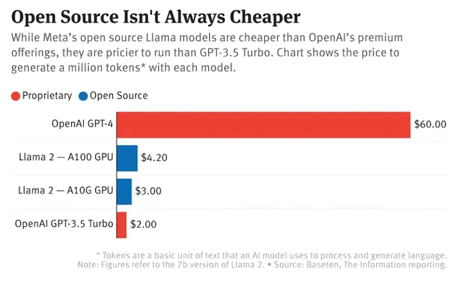 As per an article by The Information, many startups using open-source LLMs are investing approximately 50~100 percent more in running Meta’s Llama 2 model. This is much costlier in comparison to other closed-source LLMs like OpenAI’s GPT-3.5 Turbo. This is despite a significantly higher upfront investment in producing a top-tier GPT-4.