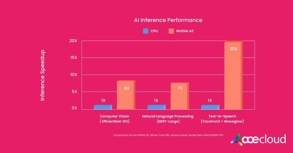 How the A2 fares against modern CPUs and last gen GPUs at inference work loads AI inference is employed to enhance the lives of consumers by delivering intuitive, real-time experiences and extracting data from trillions of end-point cameras and sensors.